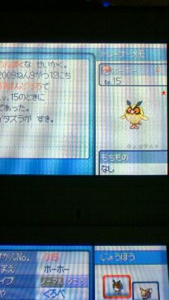 図鑑:見101、捕39 バッジ:5個 (間違えてマツバの後にヤナギさん倒しちまったい) ・めるめ (モココ) ♂ Lv26 せっかち ・くく (ベイリーフ) ♀ Lv28 ずぶとい ・ろこもこ(ロコン) ♀ Lv26 きまぐれ ・たつひこ(ギャラドス) ♂ Lv24 ゆうかん ・ピーチク(ピジョン) ♀ Lv23 せっかち ・にゃー(イーブイ) ♂ Lv5 ひかえめ 補欠 ・やどんげ(ヤドン) ♀ Lv26 やんちゃ 【所感】 電気こわい。ろこもこの投入でコイルは対処できるようになったけど、やっぱり鬼門。 めるめ。早く電気ショックより強い電気技を覚えてくれるのに期待。静電気強いね! 後は電磁波で麻痺まいたり。でも頭突きしてる方が多い気がする くく。壁貼り要因と化してる件について。だって宿り木覚えると思ったんだもん。 行く先々のジムで、相性面で虐げられてる気がするのは気のせいですか。 ろこもこ。Lv24まで上げんのに苦労した。攻撃技が石火しかないとか・・ でも今は火炎放射で活躍。やきつくせー たつひこ。赤ギャラを使ったら負けな気がして。でもLv19コイキングだから大差ない。 相変わらず強いわー噛みつくと波乗りだけで上レベルの相手をばっさばっさ。 ピーチク。どうせピジョットになる前に一群抜けするだろ・・とか思ってたら頑張る子。 ヨルノズクに変わるかと思ったけど割と頑張る子。空を飛ぶ要因も必要だし。 にゃー。名前からダダ漏れなようにエーフィ予定。懐け、懐け・・・! とりあえず次の格闘ジム戦までには進化させたいです。 やどんげ。ギャラが入る前は水・エスパーとして貴重な特攻要員でした。 イーブイ系入れたパーティにしたいよな…と考えた結果、控えの方に。 意外とバランス良くレベルが上がってるな。 大体御三家+伝説の二匹体制で突破することが多いのですけども。 とりあえずDSも一台しかないので、金銀面子でまったり進めることにします。